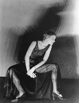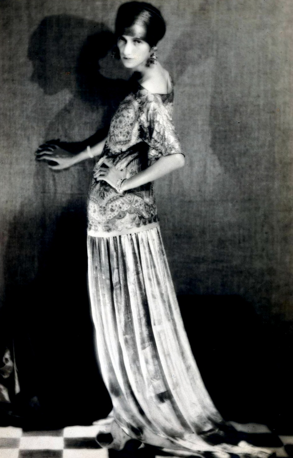 | Peggy Guggenheim en 1924 por Man Ray. Posiblemente con un vestido y turbante de Paul Poiret por el estilo oriental del bordado y la línea del vestido. |