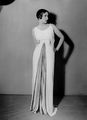 | La propia Elsa Schiaparelli posando como modeo con uno de sus espectaculares vestidos, precioso contrate con el plisado central. |